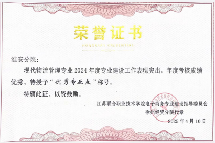 2025年(nián)4月(yuè)10-11日(rì),江蘇聯合職業(yè)技(jì)術(shù)學院電(diàn)子(zǐ)商務專業(yè)指導委員(yuán)會(huì)2025年(nián)工(gōng)作(zuò)會(huì)議(yì)在江蘇省建湖(hú)中等專業(yè)學校(xiào)順利召開(kāi)。會(huì)議(yì)現(xiàn)場(chǎng),電(d•iàn)商專指委對(duì)2024年(nián)度各分(fēn)院專業(yè)建設考核優秀單位進行(xíng)表彰。我校(xiào)經濟管理(lǐ)系現(xiàn)代物(wù)流管理(lǐ)專業(yè)獲評2024年(nián)度聯院“優秀專業(yè)點”。